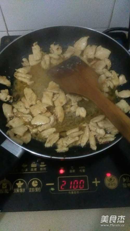 倒油热锅,把鸡肉倒进去炒至变色加入辣椒酱跟沙茶酱,翻炒入味后倒入蘑菇,加入一点点清水,再倒入酱油,炒熟后加入香菜跟味精即可