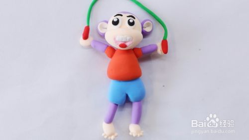 最后用红色与绿色粘土做出一根跳绳粘在它的手上就可以了