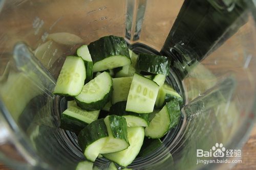 黄瓜留1/4切成黄瓜丝备用,剩下的切成小块,把黄瓜放入破壁机内,倒入半碗清水,启动果汁功能打2分钟