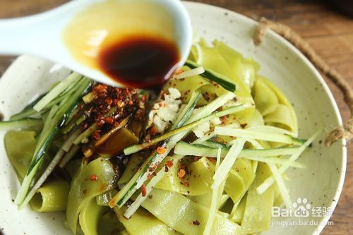 然后放入蒜末,黄瓜丝,辣椒面,淋入香醋和生抽