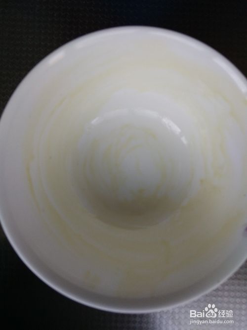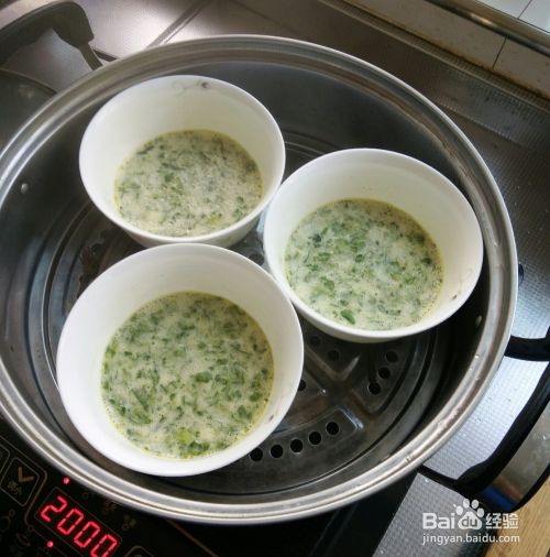 取三个小碗,碗壁上擦一层清油,将搅拌好的芹菜面粉蛋液均匀地分装到三个碗里。这个量刚好能装三半碗。