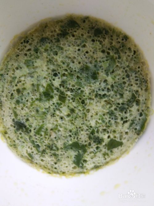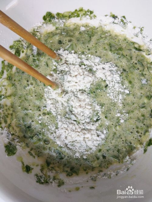 取少半碗面粉,一点一点往芹菜蛋液里面加,边加边不停地搅动,注意掌握面粉不要加的太多,加了面粉后还是要很稀才好。