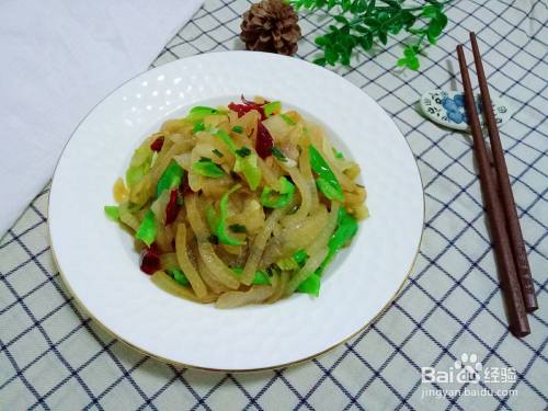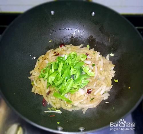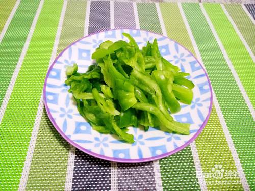倒入青椒丝翻炒均匀,撒适量鸡精翻炒均匀即可