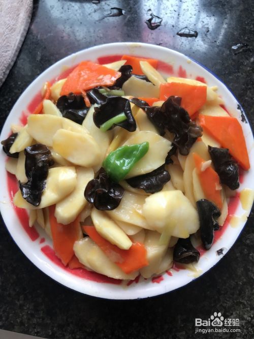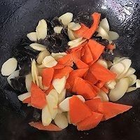 热锅下油烧热后,放入姜,山药,胡萝卜,木耳,青椒,放入适量盐,鸡精,生抽,翻炒即可