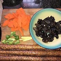 胡萝卜切成片,木耳泡发,青椒,姜,切好备用