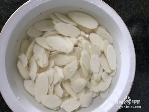 山药去皮后,切成片泡在水里备用
