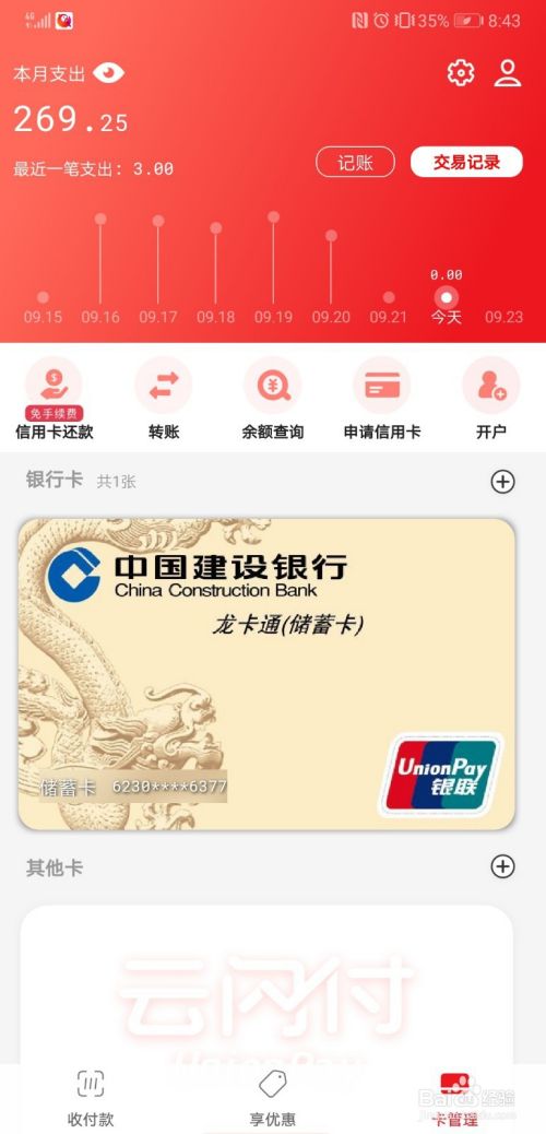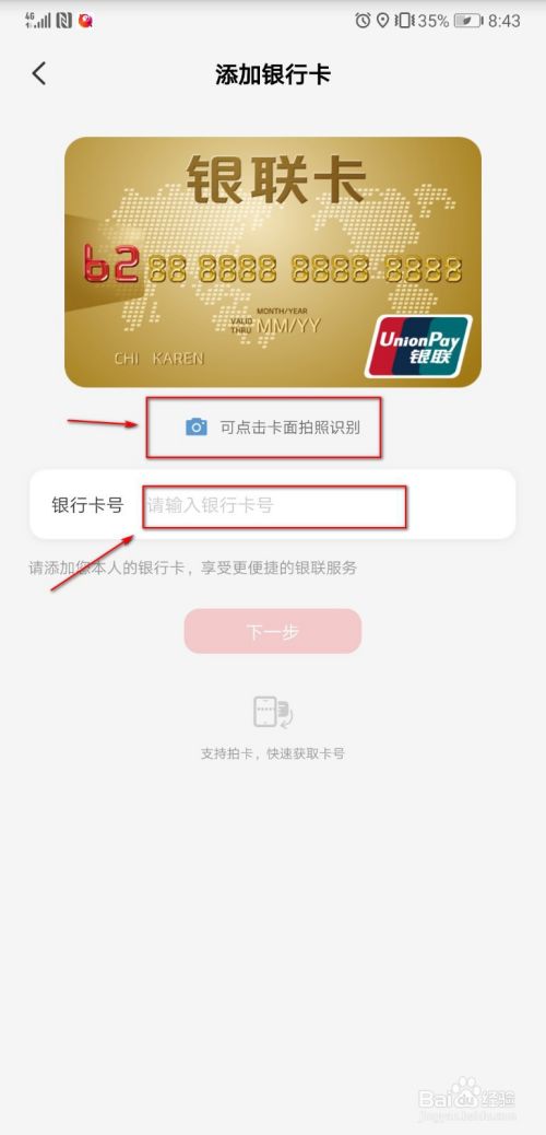 然后进入这样的页面,添加卡片可以通过1.拍照扫描银行卡片添卡;2.输入银行卡号进行添加