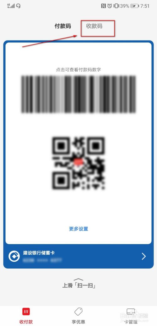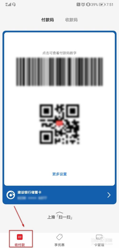 此时点击左下角的“收付款”选项,则出现了付款时的二维码,付款所使用的就是添加的银行卡账户