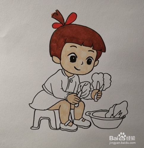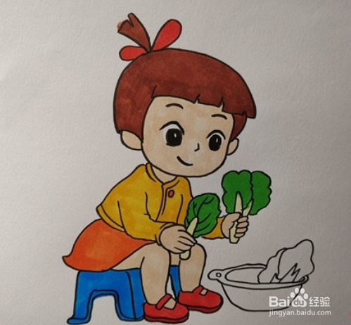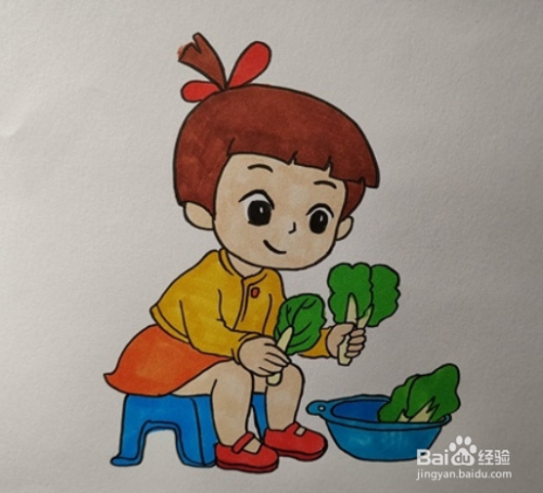 上身的衣服涂成黄色,裙子和鞋子涂红,手上拿着的白菜涂绿。