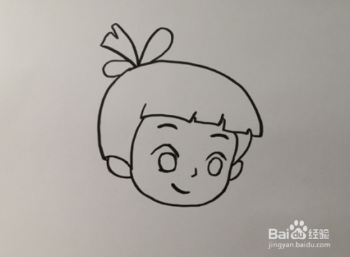首先画小女孩的头发,脑袋后面扎着一个马尾,然后再画脸部轮廓和萌萌的五官。