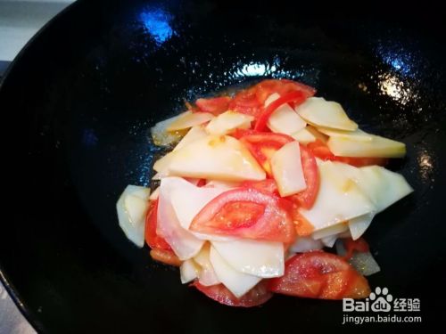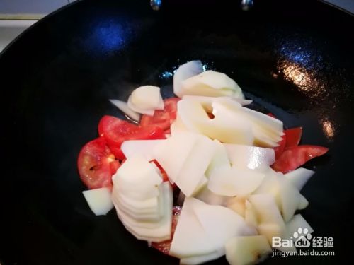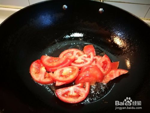 锅烧热放油,再放蒜片大火爆香,接着把番茄片倒入大火翻炒,番茄片炒的越烂越好吃。