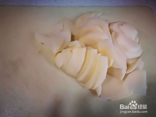 再把土豆片也倒入锅中翻炒,撒入少许的盐。