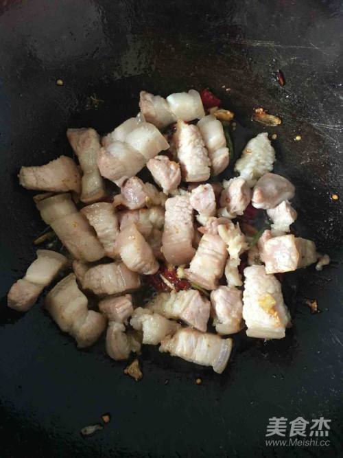 放入五花肉翻炒至有点金黄色即可