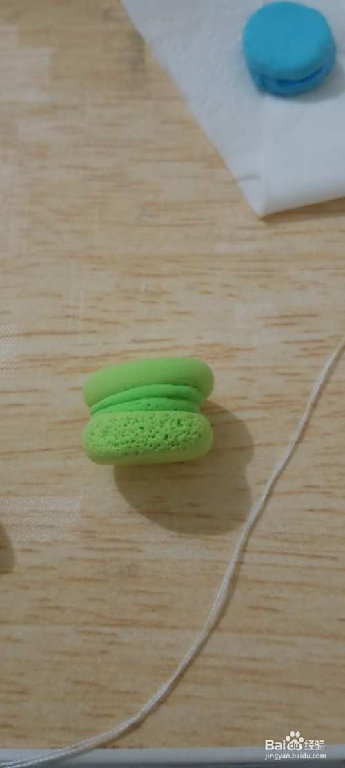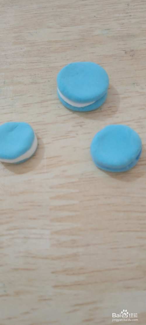 用同样的方法做出其他几个马卡龙糕点的外坯,接下来用白色的粘土用勺子压扁作为马卡龙的内馅,白色粘土要比蓝色粘土薄一点