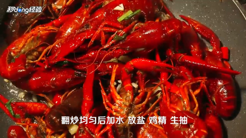 锅中倒油,放入姜丝、蒜蓉、辣椒爆香后放小龙虾翻炒均匀后加水,放盐,鸡精,生抽调味。