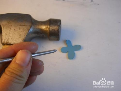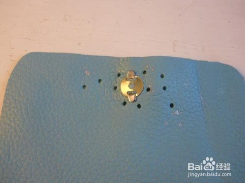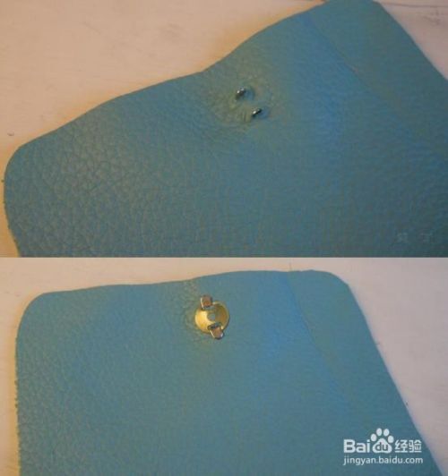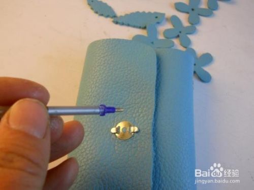 用银线笔在卡包要安装花朵的地方标记好,然后用冲子打孔!我们就在磁铁扣周围打孔安装花朵,可以挡住磁铁扣哦!