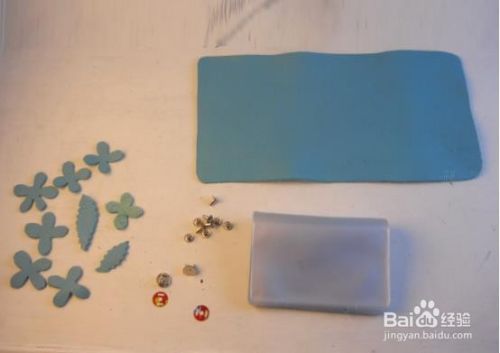 准备材料:如图裁好的皮料、铆钉9个(可以根据花朵的数量多准备哦)、磁铁扣一个、卡包内芯一个、冲子、锤子、壁纸刀、银线笔。