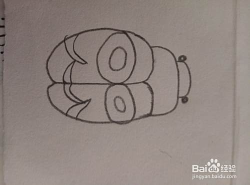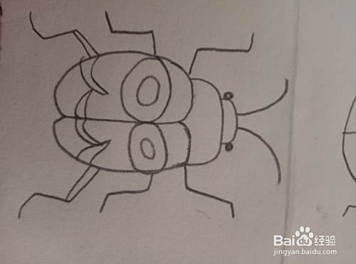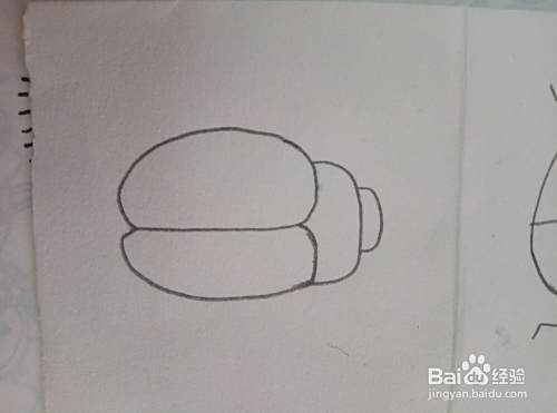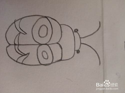 第二步:画出昆虫的身子,这里以两瓣硬壳表示,它的身子盖在壳子下面一般是看不到的
