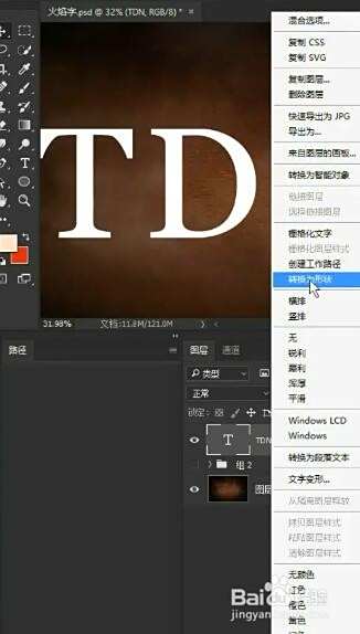 首先打上我们的文字,右键转换为形状,在路径面板双击保存我们的路径,待会要用到。