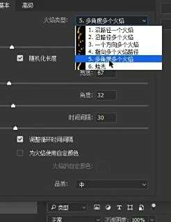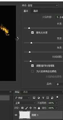 我们打开随机长度,也可以选择火焰类型,但一般选择第五个就行了。在高级面板里面可以调调整火的一个形态,都可以自己去尝试一下。