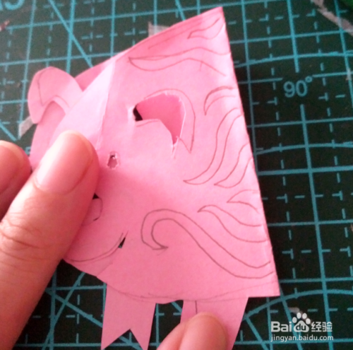 将第1条折线进行对折,同样的在上面画出纹路,注意不要打到小猪的耳朵和嘴巴。