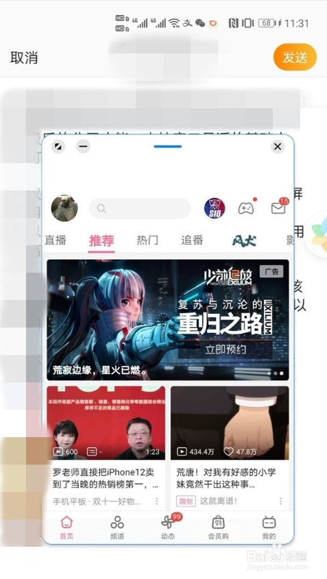 1、打开某个应用后,在屏幕左右侧边处,单指从外向内滑动屏幕并停顿,调出智慧分屏应用栏。