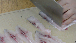 将鱼肉朝上、鱼皮朝下,第一刀切至鱼皮处但不要切断,第二刀切到鱼皮处切断,展开形成一个蝴蝶状;鱼片的厚度约为3毫米,入热汤中即熟;