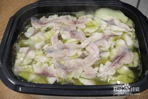 鱼片入汤中,用勺子轻轻按压使鱼片全部浸在汤中;