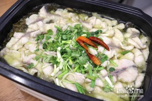 最后将鱼片充分加热成熟,把香菜段、香葱段、干红辣椒撒在鱼片表面,另起一锅烧热油,趁热泼在香菜香葱干辣椒上,吃的时候用勺子轻轻搅拌几下,使表面的调料能混合在酸菜鱼片汤中即可。