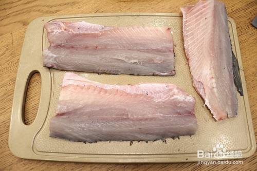 把鱼头鱼尾切掉,沿着脊梁背、贴着鱼骨将鱼肉片下来,将鱼骨剁大块;
