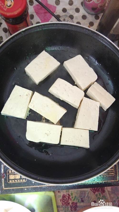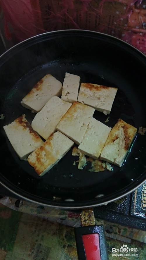 第四步,万一出现了粘锅的现象,可以慢慢的在水豆腐块上撒豆油来帮助脱离锅底,不要太用力把豆腐块搞碎掉了。3分钟左右,记得翻面,两面都要充分和锅底接触一下,才能保证熟。
