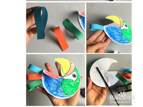 将彩条两端粘连在一起,形成一个弯弧,固定在大嘴鸟尾部