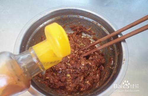 馅里放油、盐、酱油、味精、姜末顺时针搅拌