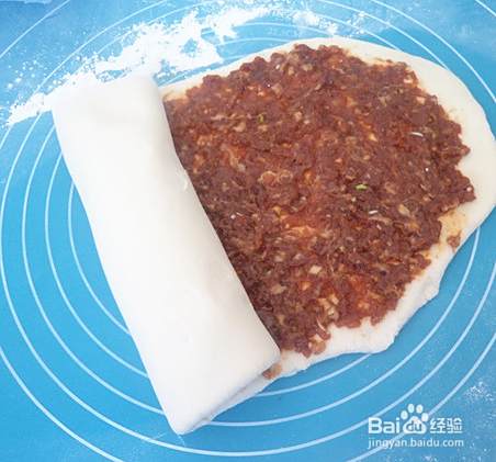 从一侧卷起。卷的时候稍微提着些,以免将肉馅赶出