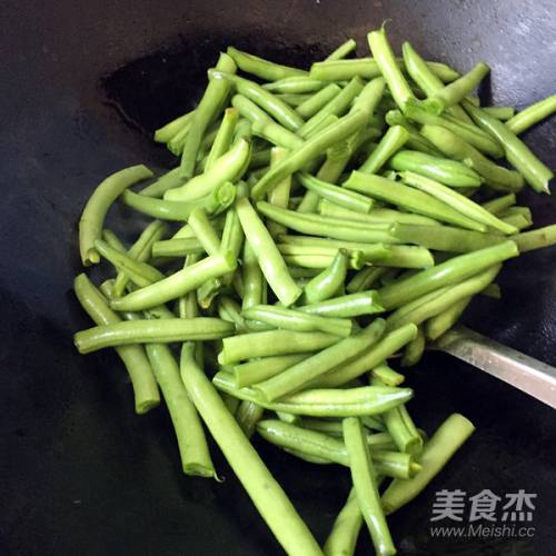 倒入豆角翻炒,煎至焦焦的好吃,(但不能煎糊了)