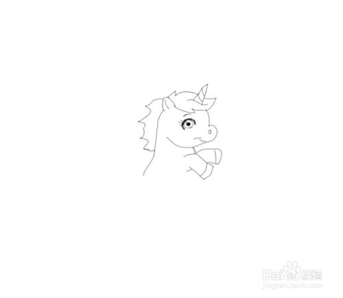 再在头部下面再画出独角兽的两条前腿,然后再在头部上画出独角兽的蹄子,如图所示:
