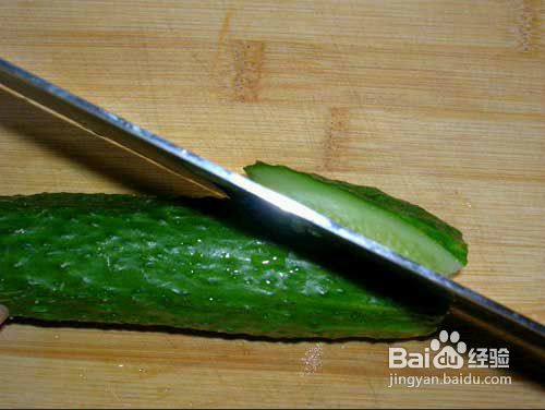 再把黄瓜上一次的切面翻朝上面。