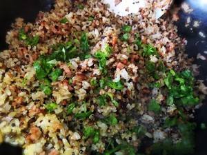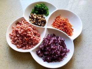 接着将炒锅热油,炒熟洋葱,胡萝卜,火腿,糯米,藜麦和葱,加入盐和一些黄酒调味。