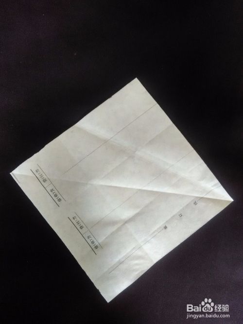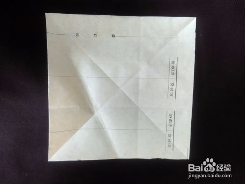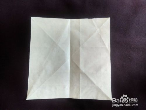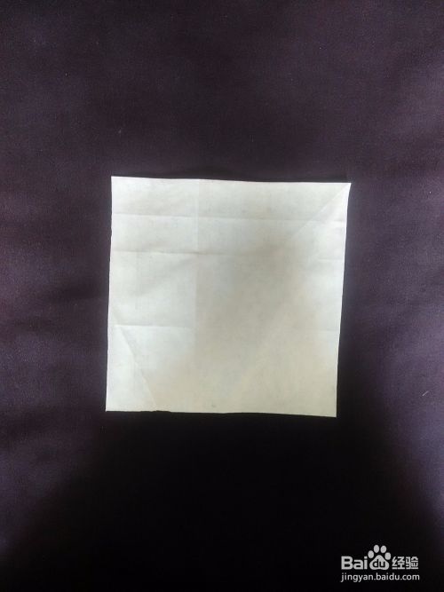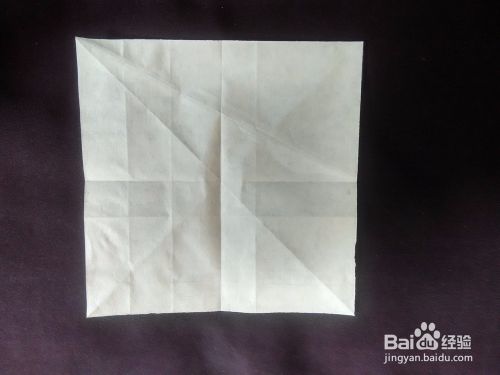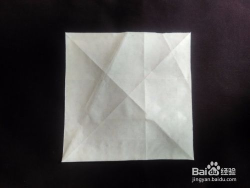 准备一张边长15厘米的正方形的纸。角角对折。打开。另外两个角也角角对折,打开。翻到背面。
