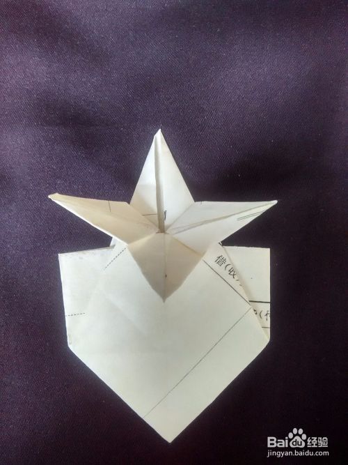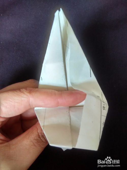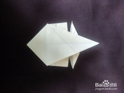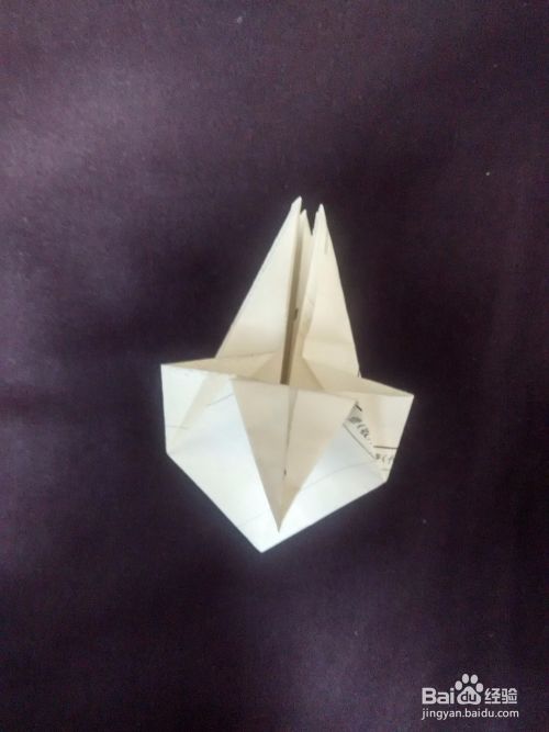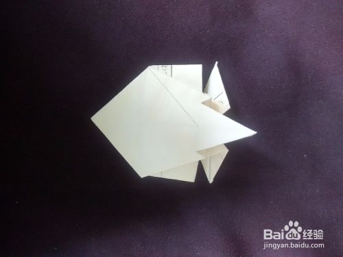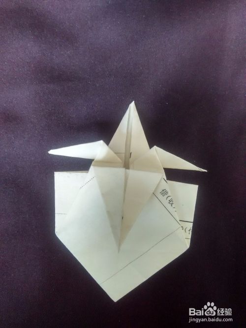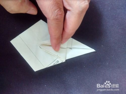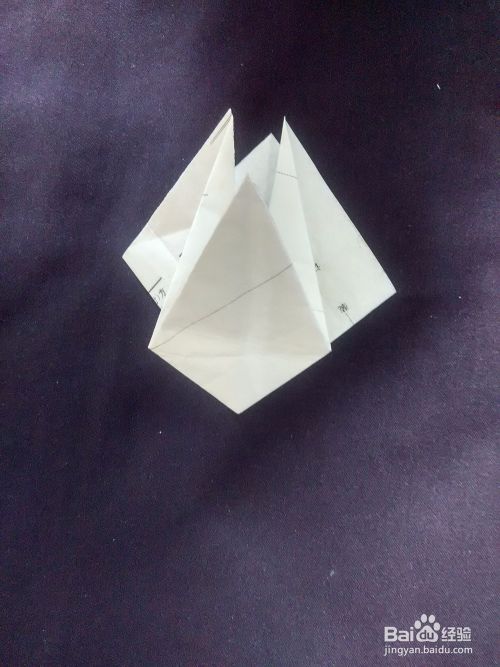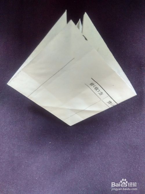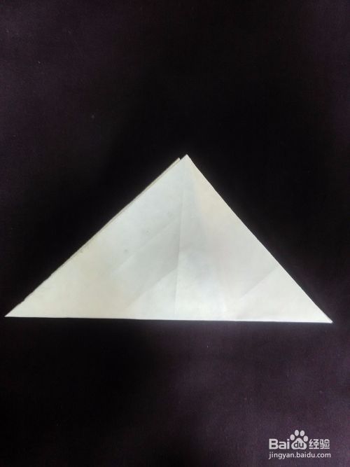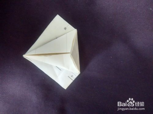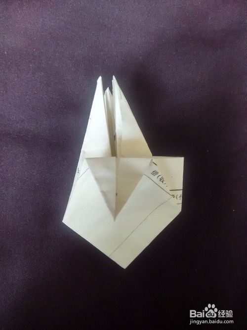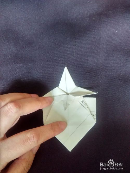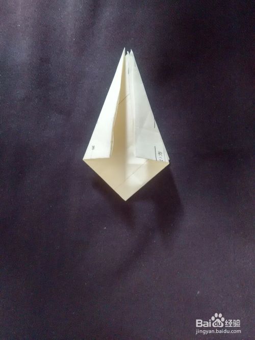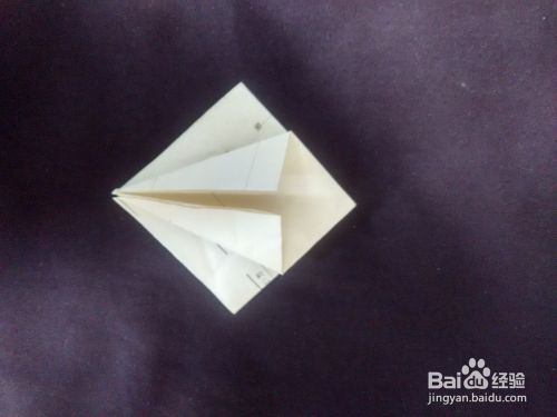 然后,折两个三角形。再将上面的三角形折下来。然后,第一层拉开。按印折成个尖角。另外一面也一样,折个尖角。
