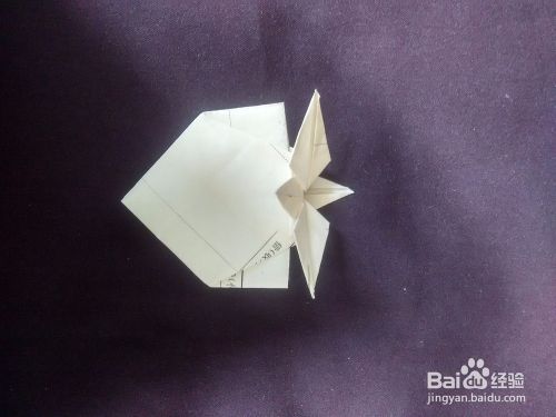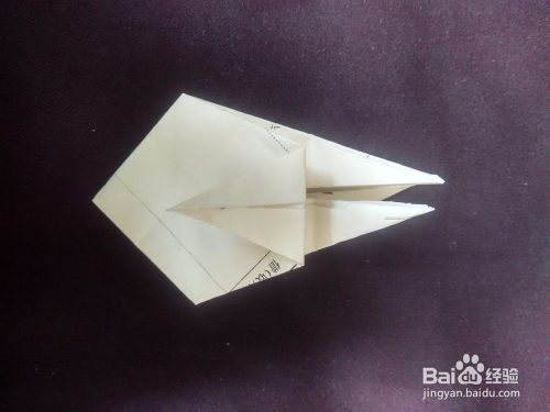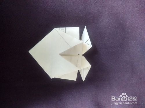 然后,将上面的两个角分别从外侧压开。压平。然后,将压平的角往上折。再折下面的角。先往上折,留出一小段,再往下折。再将上面的两个三角形放下来。