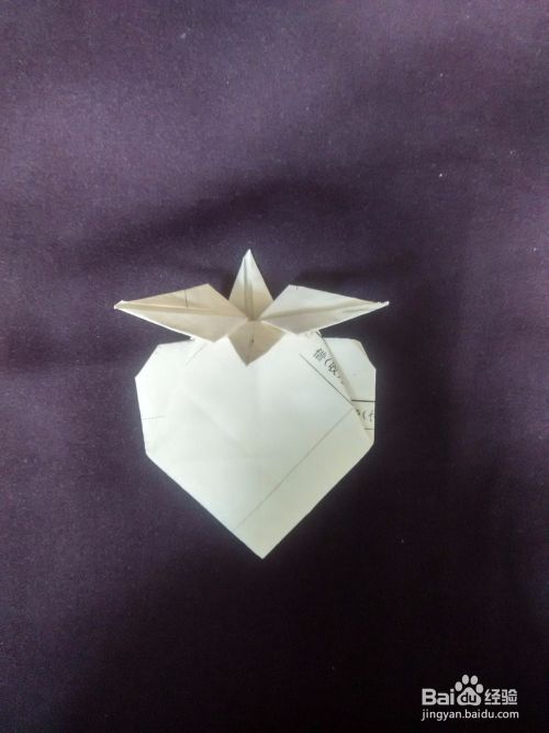 然后,翻到背面。往下折,再往上折。上面露出一个小角。好了!最后,可以将两面的角向后折一下。一颗草莓就折好了!还可以画上小点点。