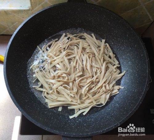 锅中烧水,水开后下千张丝,烫约2分钟,用漏勺捞起晾凉待用。