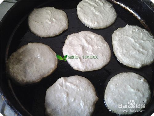 按照上面的方法,把饼子放满平底锅,但中间一定要留有距离,要不会粘贴到一起,影响品相。最后用小火,慢慢的煎饼。在这期间要勤翻动,要不会把饼煎焦了,影响口感。