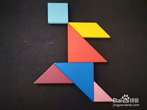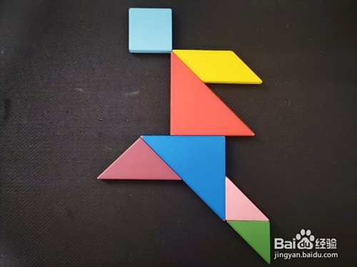 最后我们把绿色小三角形放在粉色小三角形的下面,一个跳远的人就拼好了。