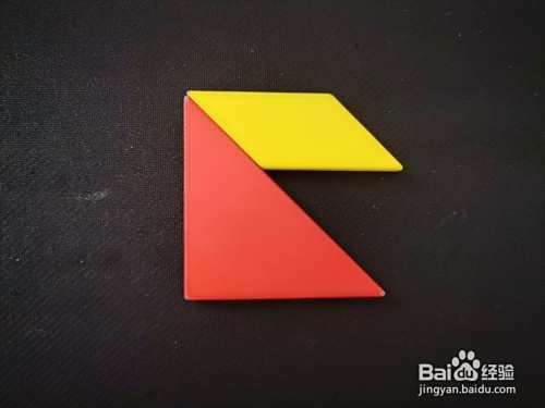 拿出一个深蓝色大三角形放在红色大三角形的下面,如下图所示。