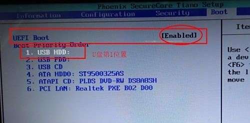 三:检查“UEFI Boot”是否为“Enabled”打开状态,U盘是否为第一启动项,tips:确保U盘启动为第1位置,如图所示。