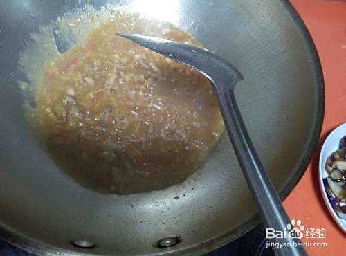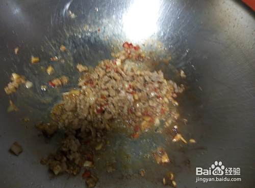 加入肉沫翻炒,加少许盐,翻炒数下,加核桃碎,红椒碎(根据自己口味),放酱油