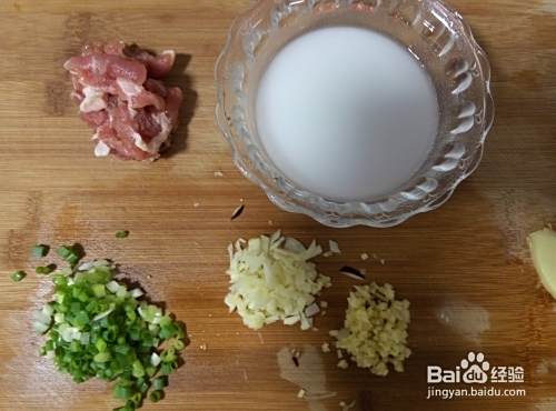 把肉切成肉沫,分别把葱、姜、蒜切碎,水淀粉准备好