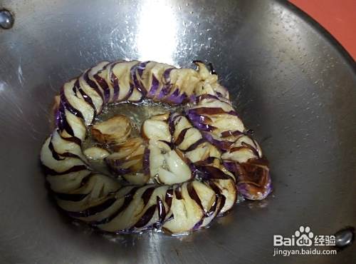一面炸软入油后再翻一面,注意适当翻动一下别粘锅,直到茄子炸透炸软